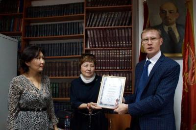 Сертификат вручили Аюне Цыремпиловне наши депутаты-коммунисты: В.А. Малышенко и Б.Ц. Цыренов под аплодисменты и вспышки фотокамер.