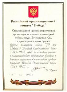 Краевой Совет Ставропольской краевой общественной организации ветеранов (пенсионеров) войны, труда, вооруженных сил и правоохранительных органов награждён президентом РФ Владимиром Путиным, возглавляющим российский оргкомитет «Победа», за активное участие в патриотическом воспитании граждан и решение проблем ветеранов ВОВ.