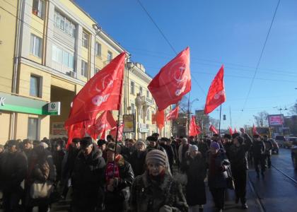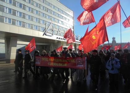 В завершение Секретарь ОК КПРФ по идеологии Владимир Аксенов зачитал резолюцию митинга: "Сегодня Россия, как и в 1917 году вновь становится слабым звеном в системе капитализма, власть ведет страну по пути новых потрясений и гибели.