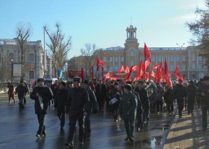 После под исполненный "Сполохом" "Гимн коммунистов Восточной Сибири" участники митинга построились в колонну и по центральной ул. Ленина двинулись колонной к Вечному Огню. Впереди, играя "Песню защитников Москвы" и "Прощание славянки" маршировал оркестр. С тротуаров за шествием наблюдали многочисленные прохожие.