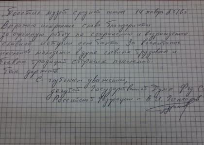 - Нелёгкий труд, - подчеркнул В.И.Гончаров, - пусть вы не часто слышите слова благодарности, но делаете очень большое дело! И сегодня, обращение к историческому факту, когда два выпускника школы стали Героями, играет огромную роль в воспитании молодёжи. В вашей школе, благодаря грамотному руководству, сложились добрые традиции, бережно передаваемые из поколения в поколение. Я тоже закончил грачёвскую сельскую школу. Много-много лет назад. Всегда нахожу время, чтобы заехать и сказать слова благодарности своим учителям. Многие из них уже на пенсии, но это не мешает нам общаться.