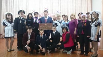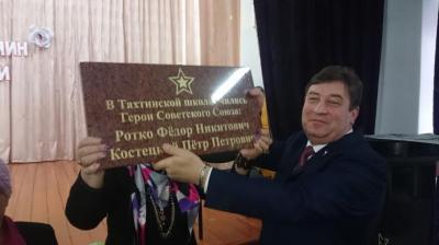 В.И. Гончаров вручил директору школы С.И. Селезнёвой памятную доску с надписью «Здесь учились Герои Советского Союза Ротко Фёдор Никитович и Костецкий Пётр Петрович».