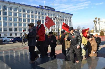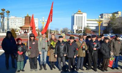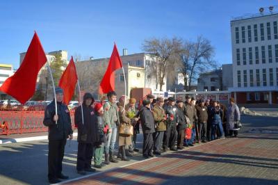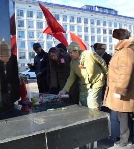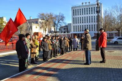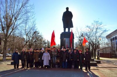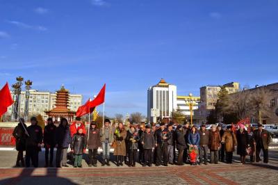 Выступили Д.Б. Эсклянова, секретарь КРО ПП КПРФ, В.А. Лебеденко, узник фашизма и Э.Б. Эрендженова, сторонница партии. В республике началась акция «Ленин ЖИВ!». Все участники акции возложили цветы к памятнику В.И. Ленина.