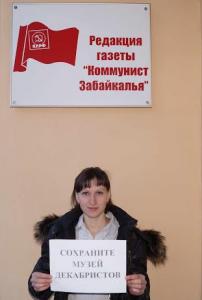 21 января 2016 г. несколько членов партии КПРФ и общественников устроили одиночные пикеты у здания арбитражного суда в Чите, где рассматривается иск мэрии к краевому краеведческому музею об освобождении пяти квартир, которые сотрудники музея декабристов использовали в качестве библиотеки, архива, кабинетов и бытовых помещений.