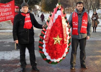 В честь 98-го Дня рождения Советской Армии и Военно-Морского Флота коммунисты, комсомольцы, жители Перми под военные марши и любимые военные песни возложили к постаменту легендарной «тридцатьчетвёрки» венок и алые гвоздики. Пикет предварил небольшой митинг.
