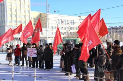 23 февраля в Якутске состоялся митинг против антинародной политики власти, нищеты и бесправия народа, в защиту армии и ветеранов Вооруженных сил, организованный Якутским рескомом КПРФ. Основные лозунги митинга — “Слава защитникам Отечества!”, “Армия, будь с народом!”, “Антинародное правительство Медведева — в отставку!”, “Требуем принять закон “О детях войны”!” и другие.