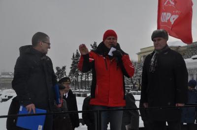 Открылся митинг выступлением первого секретаря Санкт-Петербургского горкома КПРФ, члена ЦК партии О.А. Ходуновой, которая, в частности, отметила, что события на Украине, тяжелое положение в армии, грабительская реформа ЖКХ, обнищание населения, свертывание социальных гарантий – это звенья одной цепи, и ответственность за это должно нести действующее правительство. В своем выступлении она вспомнила героический боевой путь Советской армии, создававшейся для защиты молодого советского государства, а впоследствии освободившей весь мир от коричневой чумы. Подводя итог своего выступления, Ольга Ходунова потребовала отставки действующего либерального правительства и формирования нового, ответственного правительства народного доверия.