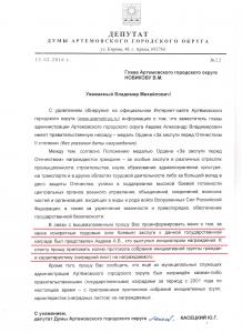 Артёмовского городского округа Новикова В.М.