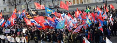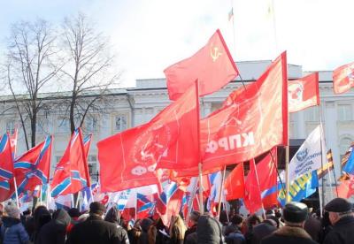 В пятницу, 18 марта, в Ярославле состоялся праздничный митинг в честь второй годовщины возвращения Крыма в состав России. Митинг собрал около полутора тысяч человек. Среди его участников было много ярославских коммунистов, державших красные флаги.