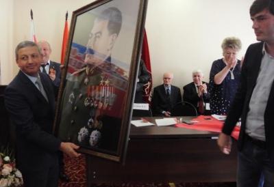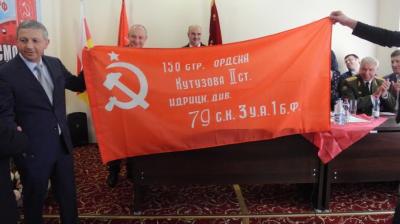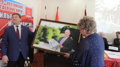 От имени всех делегатов Конференции коммунисты вручили врио Главы республики Вячеславу Битарову памятный подарок: портрет И.В. Сталина и точную копию Знамени Победы.