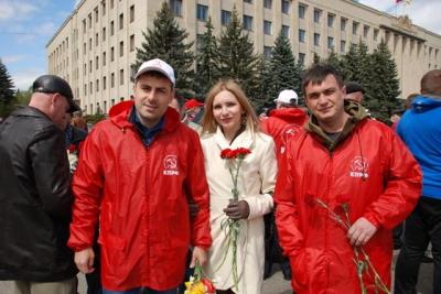 коммунистов и комсомольцев в одежде с партийной символикой и красногалстучная