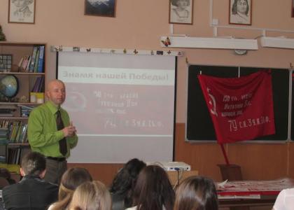 В Нижегородской области продолжаются военно-исторические уроки «Знамя нашей Победы!». На этот раз комсомольцы под руководством регионального координатора акции «Знамя нашей Победы», Александра Юхтарова посетили среднюю школу № 1 г. Дзержинск.