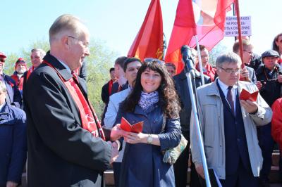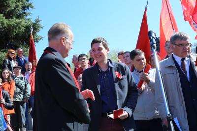 По традиции на митинге прошло торжественное вручение партийных билетов тем, кто вступил в КПРФ в марте-апреле. На этот раз билеты получили 22 человека – рекордная цифра для таких мероприятий. Рост партии идет, меняется и качественный состав молодых коммунистов. Так, партийный билет был вручен депутату Москаленского районного Совета Брониславу Дроздовичу. Он выдвигался от КПРФ как «беспартийный сочувствующий», победил на выборах и постепенно дошел до решения вступить в партию.