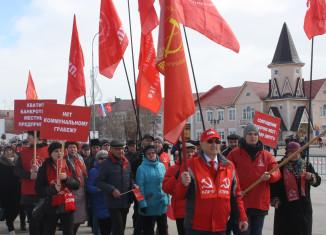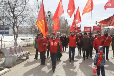 Колонна коммунистов и сторонников КПРФ прошла по улице Смидовича — центральной улице г. Нарьян-Мара с лозунгами, кричащими о позорном для нефтяного региона банкротстве предприятий и сокращении рабочих мест, необходимости обуздания распоясавшихся коммунальщиков.