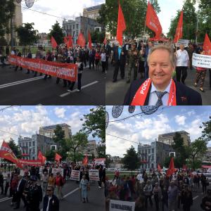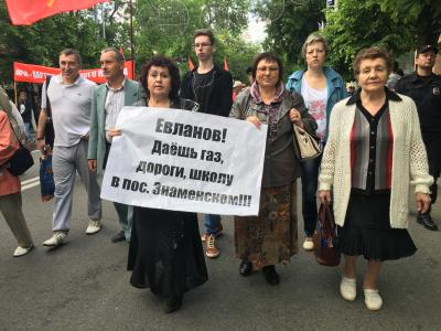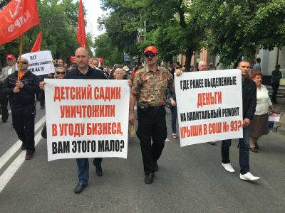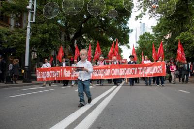 Над колонной, которая шла под марши, исполняемые духовым оркестром, реяло множество красных флагов. Участники акции несли транспаранты – с социально-экономическими лозунгами и требованиями, обращенными к властям всех уровней – от федерального до местного. С помощью мегафонов озвучивались лозунги праздника и протеста.