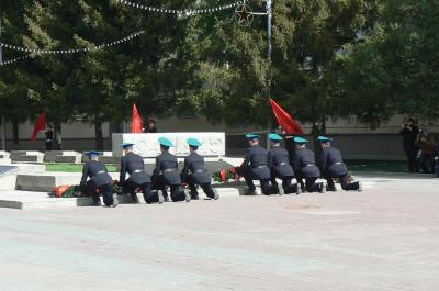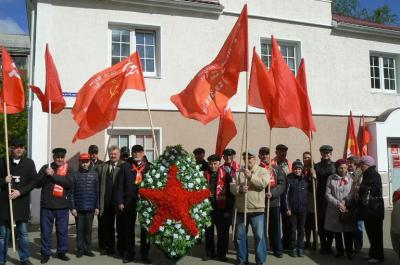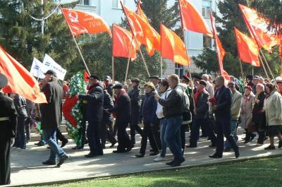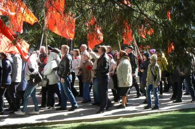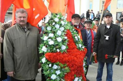 Шествие получилось яркое и красочное. На площади у Вечного огня стояли кадеты с красными знаменами и со знаками фронтов. Нарядные горожане возложили венки к обелиску. Свой венок с красной звездой водрузили и коммунисты. Затем они сфотографировались на память.