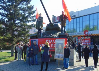 Также в этот день коммунисты Железнодорожного райкома с 10-00 до 13-00 провели традиционный пикет на бульваре Защитников Сталинграда возле танка Т- 34, входящего в комплекс Мемориала Славы. У подножья памятника была установлена растяжка с портретом Иосифа Виссарионовича Сталина и лозунгом: «Сталин, Победа – да! «Десталинизация» - нет!». Два молодых коммуниста, одетые в военную форму, в течение всего мероприятия стояли на танке с копиями Знамени Победы.