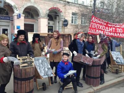 На протяжении движения колонны по сторонам главного проспекта Мурманска – проспекта имени Ленина – школьниками были реконструированы события военной поры.