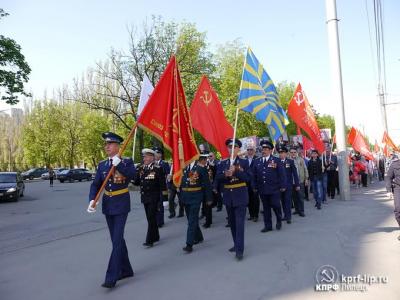 Праздничная демонстрация коммунистов началась у ДС "Звёздный". В начале колонны по традиции шли офицеры областной общественной организации "Союз советских офицеров" и молодые коммунисты с портретами маршалов Победы.