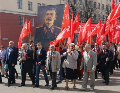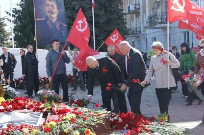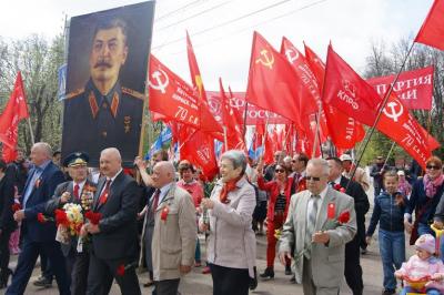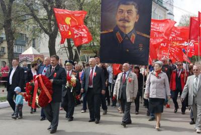 Стоявшие плотной стеной по маршруту следования колонны жители города радостно приветствовали участников шествия, подхватывали лозунги и кричалки КПРФ, охотно фотографировались на фоне большого портрета Сталина.