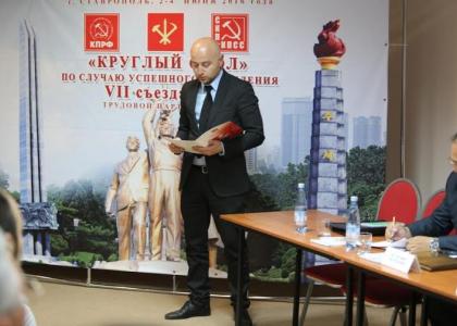 Вёл заседание круглого стола К. К. Тайсаев. В своём вступительном слове Казбек Куцукович отметил тесное сотрудничество КПРФ и ТПК, которое успешно развивается на основе договора, заключённого между партиями, и выразил уверенность в том, что визит корейских товарищей в нашу страну придаст этому сотрудничеству новый, дополнительный импульс.