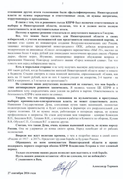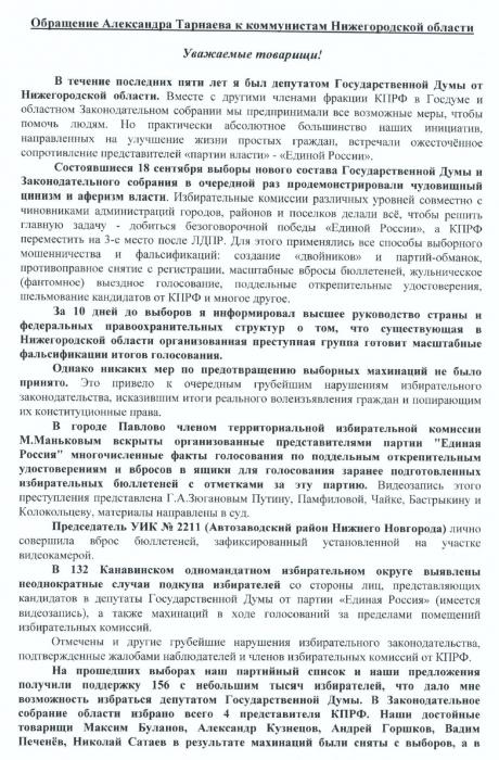 Обращение Александра Тарнаева к коммунистам Нижегородской области