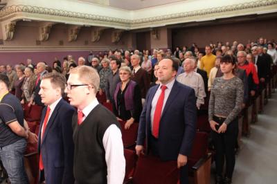 Торжественное собрание завершилось под звуки гимна коммунистов – Интернационала, который зал спел хором.