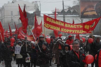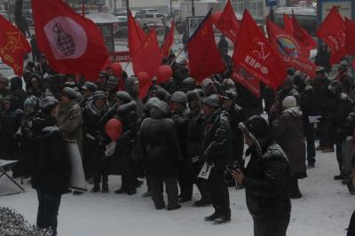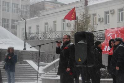 Шествие в колонне проходило с озвучиванием лозунгов ЦК КПРФ, воспроизведением революционных песен. Вопреки ураганному ветру и метели, колонна прошла до места проведения митинга у памятника В.И. Ленину. К памятнику В. И. Ленину от имени демонстрантов был возложен венок и цветы.