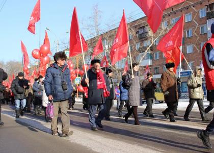 Традиционный маршрут праздничного шествия под марши Абаканского духового оркестра проходил от гостиницы Дружба до Первомайской площади. На всем пути до памятника Владимиру Ильичу "красную" колонну поздравляли и приветствовали абаканцы, а в окне многоэтажки магазина "Орбита" даже вывесили пурпурный флаг и размахивали им!