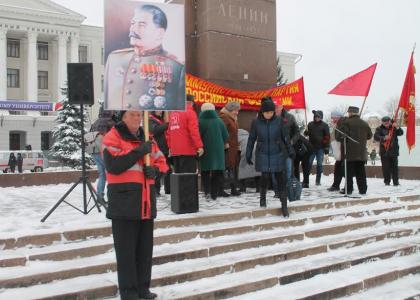 Торжественная колонна начала свое шествие от магазина «Маяк» в полдень. Около сотни человек под звуки коммунистическихлозунгов проследовалипо Рижскому проспекту до площади Ленина, где в 13 часов состоялся торжественный митинг. Собравшиесявозложили цветы к памятнику великого Вождя.