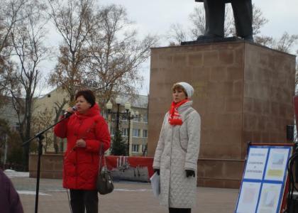 Митинг, посвященный 99-й годовщине Великой Октябрьской социалистической революции, в Южно-Сахалинске состоялся в обеденный перерыв. Обрадовало, что, несмотря на холодную погоду, участие в митинге приняли не только члены КПРФ.