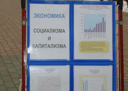 Неприятный сюрприз преподнесли блюстители порядка – запретили до официального начала митинга разворачивать атрибутику, плакаты. Несмотря на спешку, вниманию граждан были представлены стенды с информационными материалами, демонстрирующими преимущества социалистической системы, чучело капитализма.