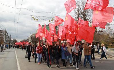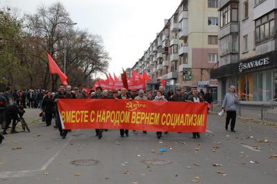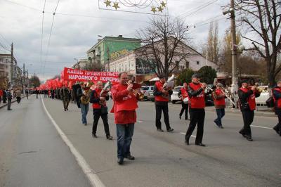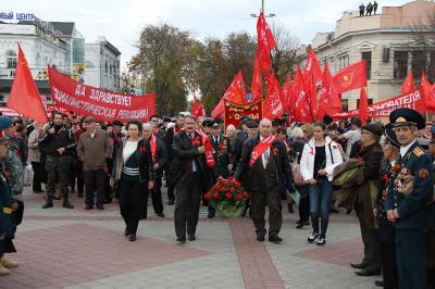 Колонна коммунистов и единомышленников партии под звуки оркестра и лозунги Октября прошла от парка Тренева до площади им. В. И. Ленина. Офицеры, ветераны, трудовой народ, молодежь, симферопольцы и гости крымской столицы - все шли отпраздновать эту великую дату – дату Великого Октября. Комсомольцы несли огромный Советский флаг. «Вернем завоевания Октября!», «Нет превращению земли-кормилицы в товар!», «Нет антинародным реформам», «Каждой семье – тепло и благополучие» - эти и многие другие народные лозунги звучали во время шествия колонны.