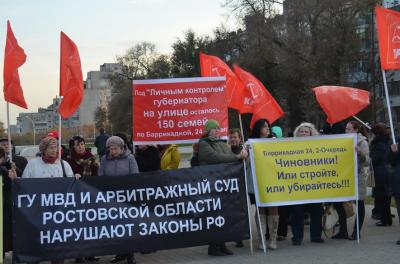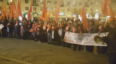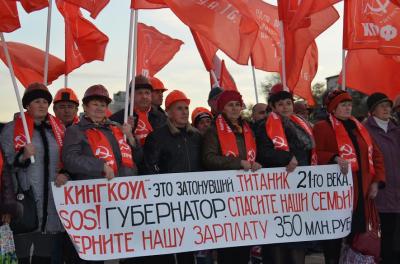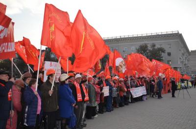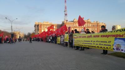 знаменами КПРФ и ЛКСМ РФ шахтеров, обманутых дольщиков, жителей дачных
