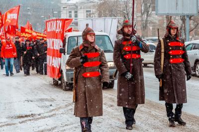 партии в буденовках, с флагами и транспарантами прошли от Дальзавода по улице