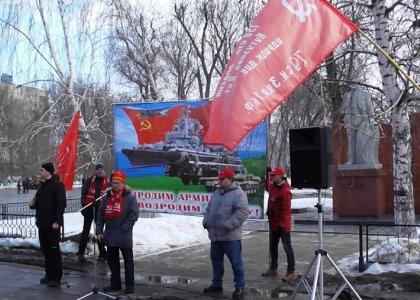 23 февраля – День Советской Армии и Военно-Морского Флота саратовские коммунисты и комсомольцы отметили демонстрацией и торжественным митингом в поддержку Российской Армии, оборонной промышленности и науки, против бездарной, антинародной политики буржуазной власти, против роста тарифов на ЖКУ, против непринятия срочных мер по социальной защите трудящихся, пенсионеров, молодёжи и студентов.
