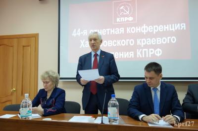 8 апреля состоялась 44-я отчетная конференция Хабаровского краевого комитета КПРФ, которая подвела итоги работы краевой партийной организации за последний год (с апреля 2016 по апрель 2017 гг.). В работе конференции принял депутат Государственной Думы, секретарь ЦК КПРФ А.В. Корниенко.
