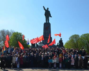 Под красными флагами коммунисты праздничной колонной поднялись к памятнику, чтобы возложить цветы к его подножию.