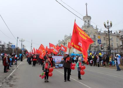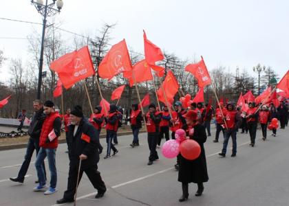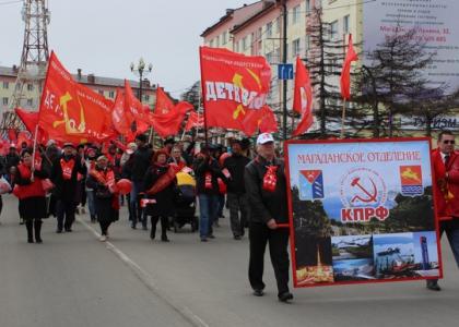 Магаданские коммунисты приняли участие в общегородском шествии, посвященному этому празднику. Яркие, красочные колонны предприятий, общественных организаций, политических партий рекой текли по главной улице города – проспекту Ленина, к центральной площади города.