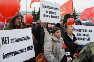 От рабочего коллектива Барнаульского магистрально-сортировочного центра выступила Татьяна Бочарова: «Может показаться, будто «Почта России» – процветающая компания. Ведь генеральный директор Дмитрий Страшнов в прошлом году, например, получил премию в 95 миллионов рублей. Только за какие заслуги – не понятно. С каждым годом убытки «Почты России» только растут. Простые работники почты получают нищенскую зарплату. А над нами замаячил топор оптимизации. Вот недавно появились слухи, что два наших маршрута передают Новосибирску. А их у нас всего три. Что это значит? Что десятки людей просто лишатся работы.