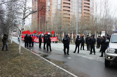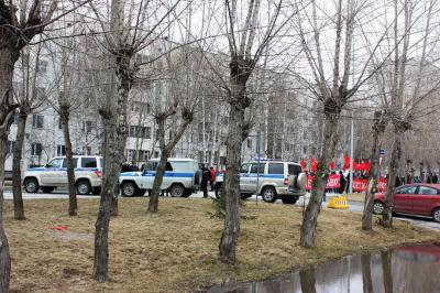 Около 80 человек выстроились под знаменами КПРФ в г. Сургуте для участия в первомайском шествии. С собой они несли нарисованные от руки транспаранты, растяжки и флаги. Дорогу колонне коммунистов перегородили спецавтомобили и более 20 сотрудников полиции. Им не понравились лозунги.
