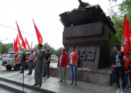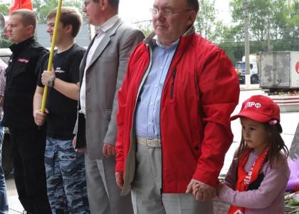 После торжественного построения открывает митинг первый секретарь Железнодорожного РК КПРФ, член бюро ОК КПРФ А.Н. Бобовников. Он приветствует всех, кто решился на такое большое расстояние проехать на велосипеде.