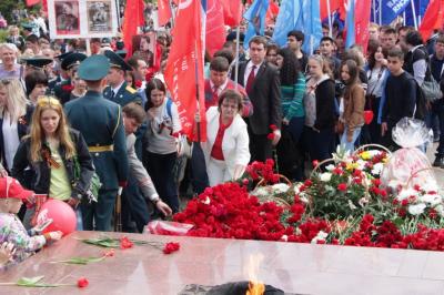 Мимо них проходили тысячи людей, а первый секретарь Саратовского горкома КПРФ, депутат гордумы Александр Анидалов и секретарь Саратовского горкома КПРФ, депутат гордумы Геннадий Турунтаев через мощные мегафоны неустанно поздравляли их с праздником 9 мая, провозглашали здравицы в честь победителей и организаторов Великой Победы, а все остальные, разбившись на два «красных островка», раздавали красные ленточки – маленькие копии Знамени Победы, воздушные шары с эмблемами КПРФ и СССР, красные флажки с надписями: «СССР» и «9 мая - День Победы», агитационную литературу и пели песни Великой Отечественной войны.