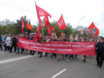 Громогласным «ура!» участники манифестации поддерживали лозунги и поздравления, с которыми первый секретарь Тамбовского ОК КПРФ А.И. Жидков обращался к тамбовчанам: «С праздником Великой Победы!», «Да здравствует советский народ! Народ победитель и созидатель!», «Слава Красной Армии и Военно-морскому флоту Советского Союза, свернувшим хребет фашистскому зверю! Слава Верховному главнокомандующему И.В. Сталину и всем советским полководцам! Слава труженикам тыла!», «Да здравствует нерушимая дружба народов СССР!», «Да здравствует Коммунистическая партия – вдохновитель и организатор всех побед!» и др. Впереди колонны коммунисты несли портреты Сталина и советских военачальников, 10-метровый флаг КПРФ. Участники праздничной колонны пели песни времён Великой Отечественной войны, раздавали всем желающим партийную газету «Наш голос».