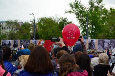 С 7 часов утра на центральной улице города, работала площадка КПРФ, посвященная Великой Победе. Несмотря на проливной дождь, сотни оренбуржцев и гостей города фотографировались у макета Мавзолея В.И. Ленина с брошенными к его подножию знаменами разгромленных фашистских армий и у портрета Верховного Главнокомандующего со Знаменем Победы в руках. По периметру площади возвышались Штандарты Фронтов с портретами Командующих. Более трёх тысяч экземпляров печатной продукции и двух тысяч наполненных гелием шариков с символикой КПРФ раздали комсомольцы.