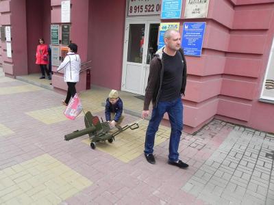 с пластиковым «максимом», украшенным флажком с портретом Сталина, папа с таким
