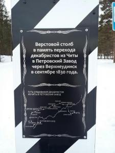 На территории Республики Бурятия установлено пять памятных знаков в виде «верстовых столбов», в местах дневок декабристов, совершавших переход из Читы в Петровский Завод в 1830 году. Проект, начатый в прошлом году при поддержке депутата Государственной Думы В.Г. Позднякова, продолжается.