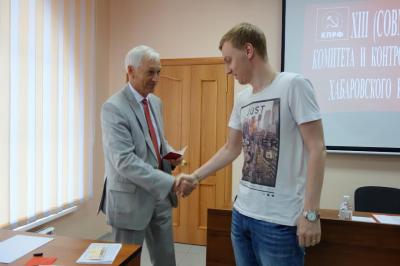Состоялся Пленум Хабаровского краевого комитета КПРФ, на котором коммунисты обсудили итоги XVII Съезда КПРФ. Перед началом Пленума были по традиции вручены партийные билеты принятым в ряды партии молодым товарищам.