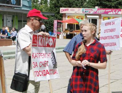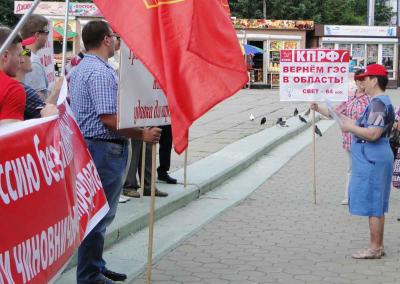 15 июля в Благовещенске состоялся пикет «За Россию без криминальной олигархии и чиновничьего беспредела». Возле Универмага собрались активисты партийной организации и комсомольского движения. В числе пикетчиков были первый секретарь горкома КПРФ Нина Тямкова, первый секретарь райкома КПРФ Александр Талалай, председатель КРК Амурского областного отделения Валерий Песенков.