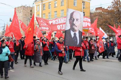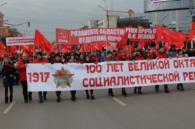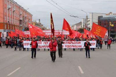 В честь 100-летия Великой Октябрьской социалистической революции в Рязани состоялось краснознамённое шествие по центральному проспекту областного центра под лозунгами «Да здравствует Великая Октябрьская социалистическая революция!», «Правительство Медведева — в отставку!», «Нет росту цен и тарифов!», «Руки прочь от Ленина!».